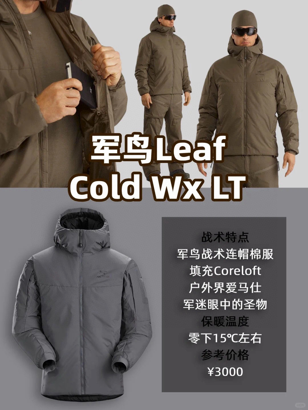 Arcteryx始祖鸟 始祖鸟军鸟系列Leaf Cold Gen 2 防风保暖连帽棉服 二代军鸟棉服. 近两年大火的环境下,有机会入手‘军鸟’的机会还是比较推荐的。毕竟一分价格一分货,确实是到手值得细品的衣服。军鸟品质做工真的没话说,比民鸟更秀气的logo也不会很招摇,俗称C棉的Coreloft棉填充,穿着轻巧舒适 比羽绒更透气,压缩性更好,湿了仍然能够有效保暖,C棉保暖性和600充绒的羽绒服差不多,gore-tex infnium材质防风防小雨,面料方面40DGore-Tex加持,性能基本是拉满了。肩部/手臂的弯刀剪裁,能完美衬出身型,上身各种动作也不会觉得拉扯。手臂两侧魔术贴可以粘自己喜欢的士气章可玩性高。 两侧手臂有拉链口袋,可以放置小物品。下摆两侧有插手袋,保持手部温暖。内侧一个大容量口袋,可以装许多物品。内部小立领和抓绒有效防风灌入和保持脖子温暖。下摆和帽子处都有收紧设计,使衣服更贴身。主拉链有防刮设计,防止拉链刮伤皮肤。领部有挂钩,方便进门脱下挂起来。腋下3D立体设计,使得身体活动自如。衣长前短后长,下蹲时衣服背后不会漏出来。 无论是喜欢军鸟的鸟迷,还是有着户外需求,登山徒步还是出门上街都是不错的选择。