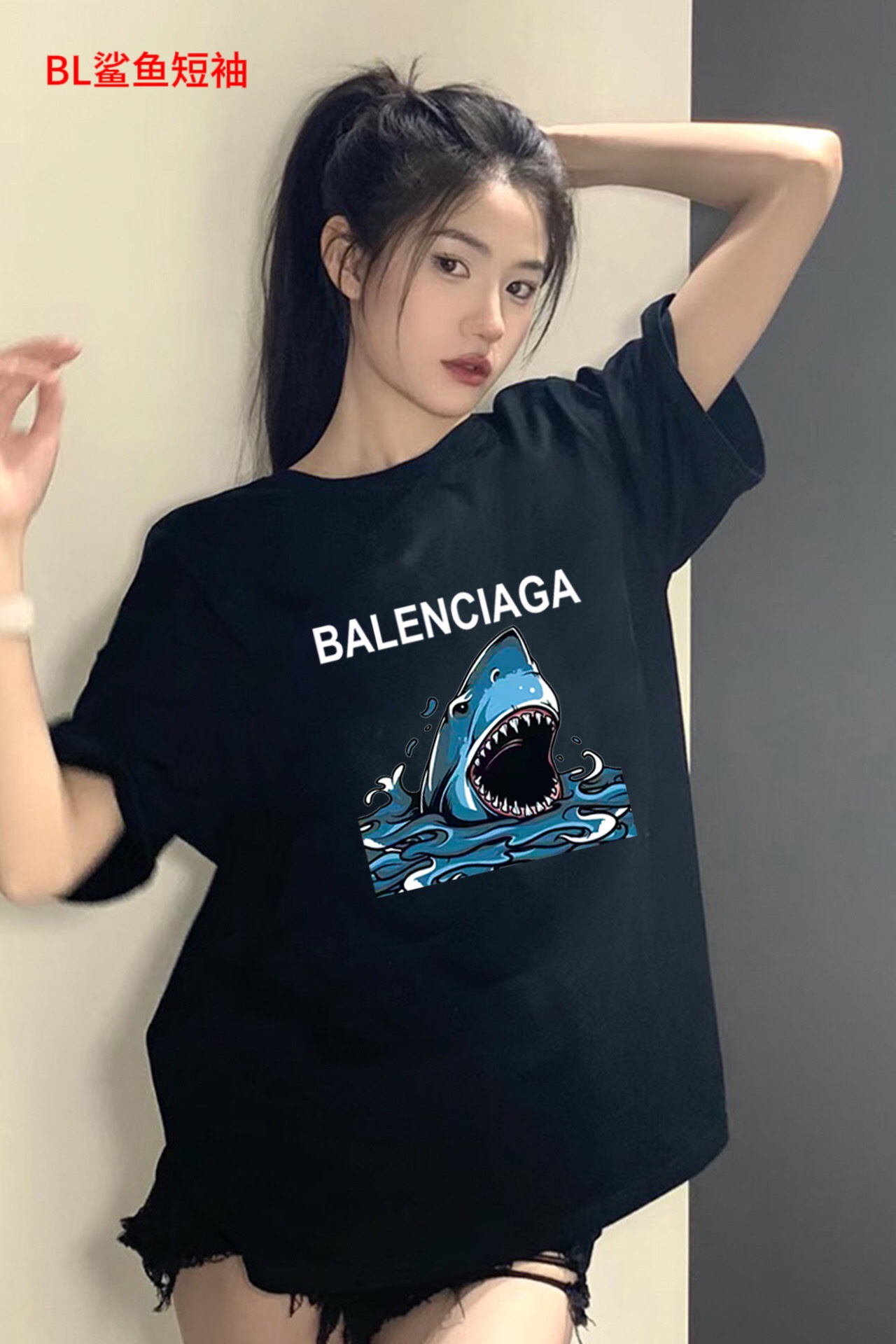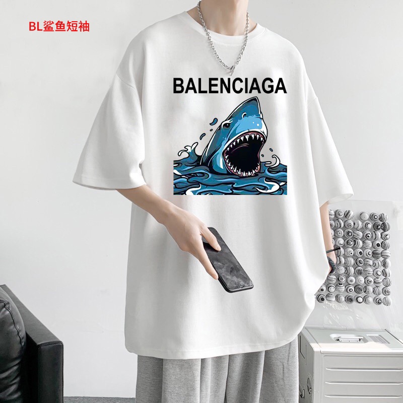 BL鲨鱼短袖Balenciaga巴黎世家 2023鲨鱼印花宽松百搭情侣款短袖男女同款 情侣款 申州公司客供纯棉面料 亲肤宜人 透气舒适 进口康丽数码直喷工艺 色泽清晰 质