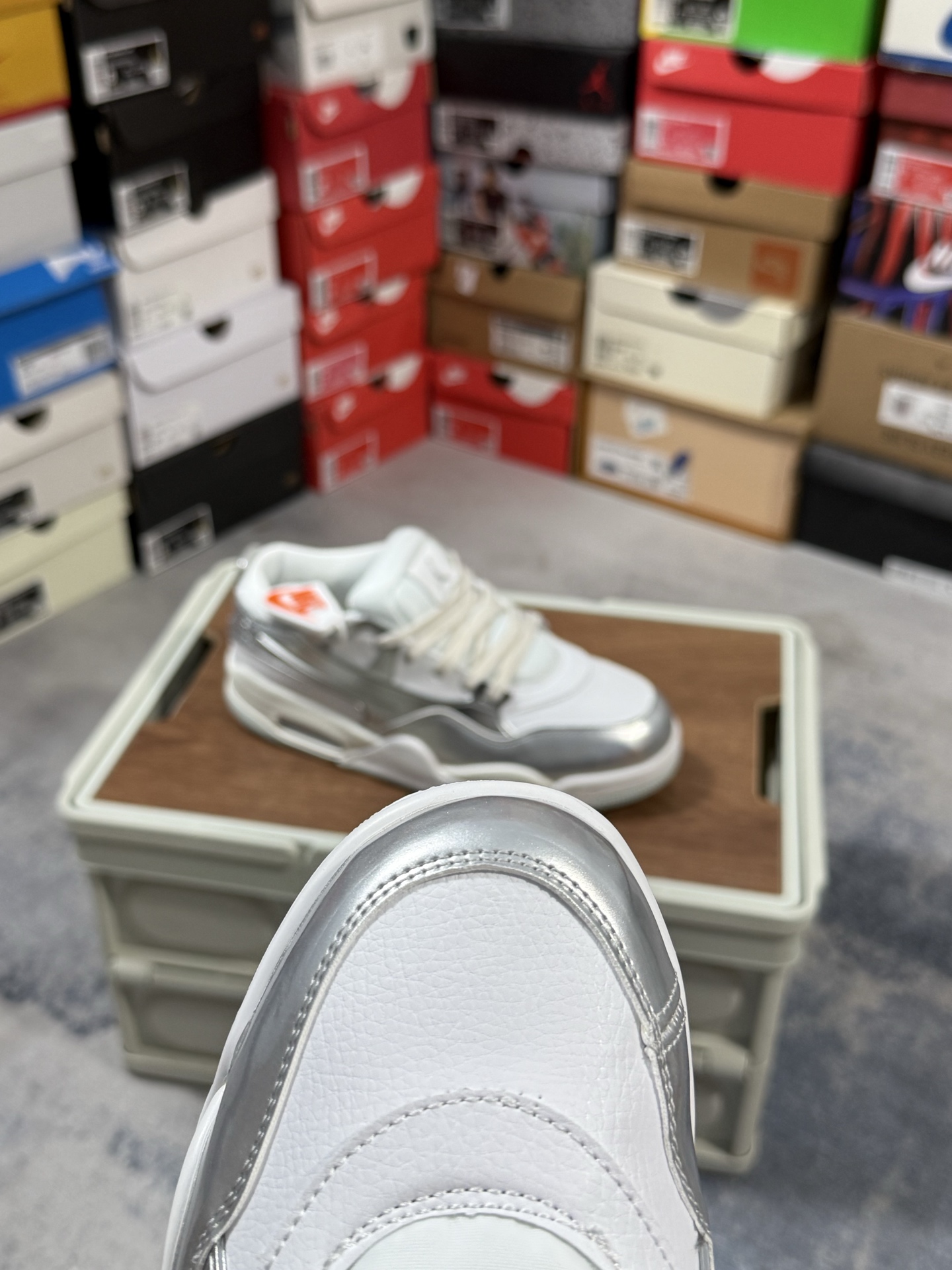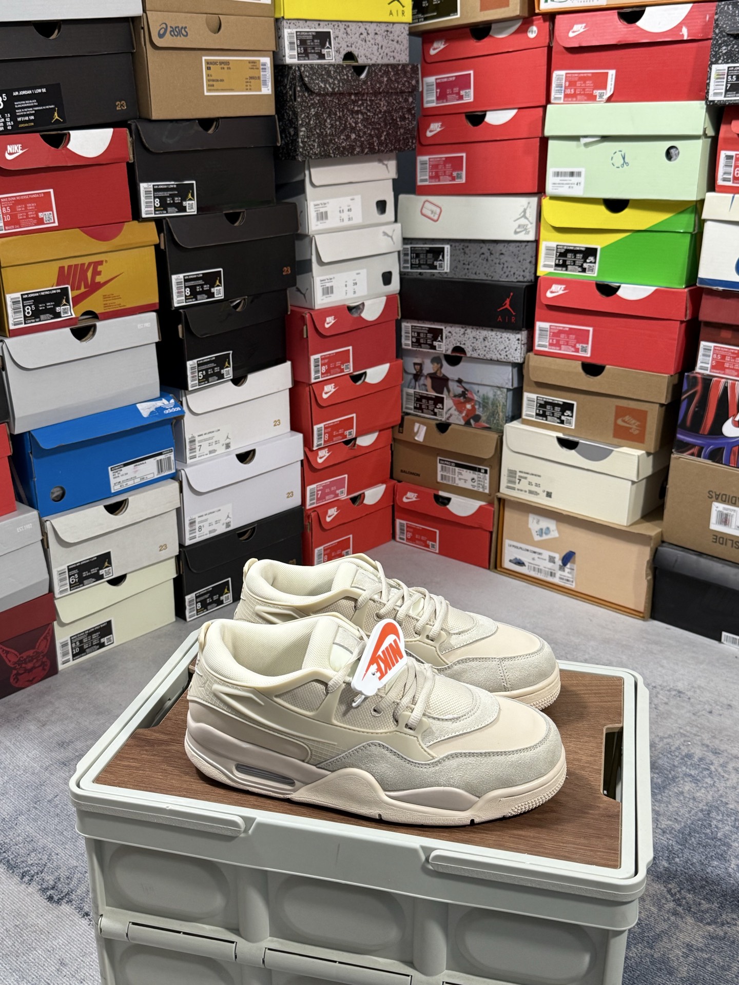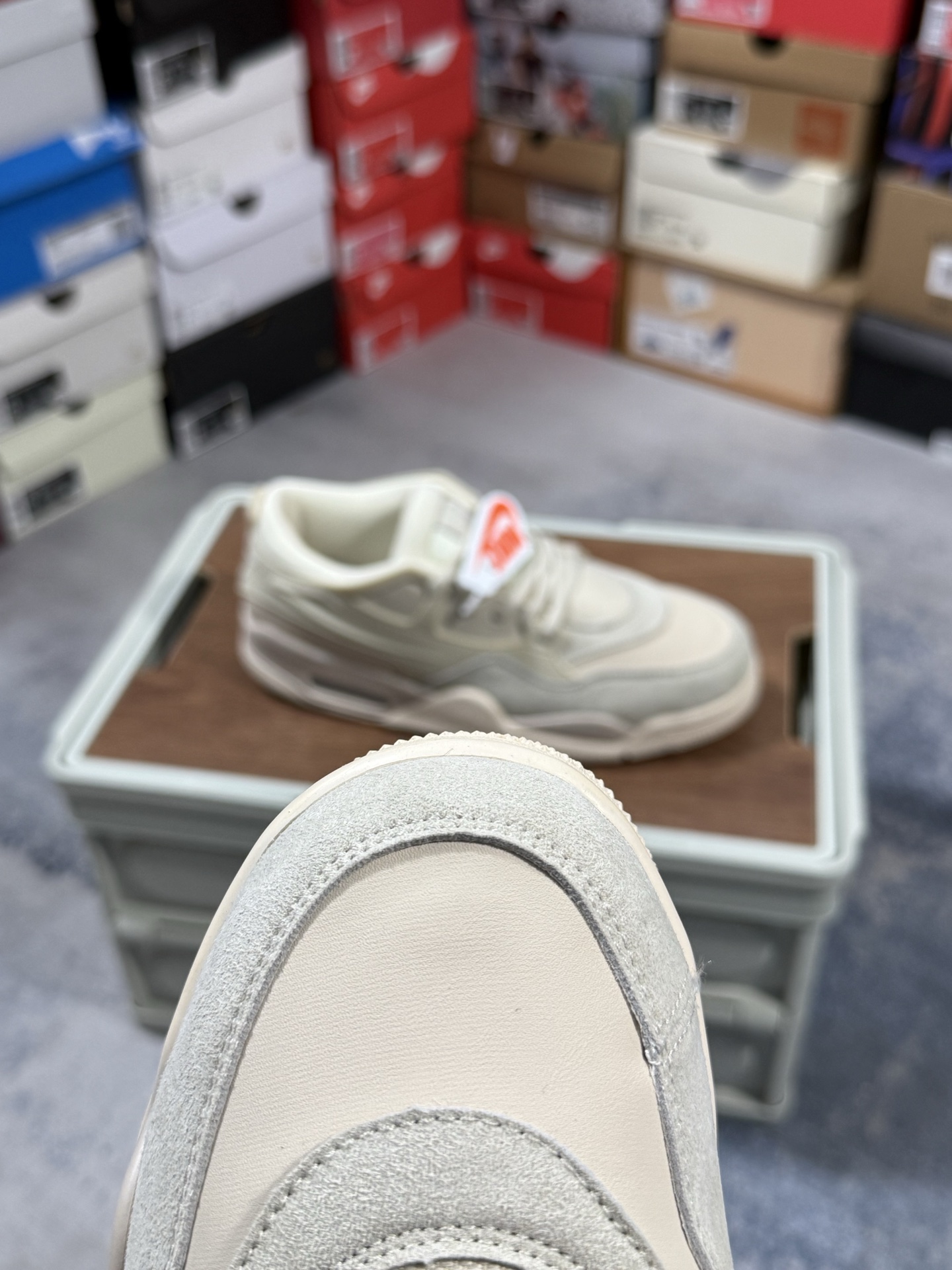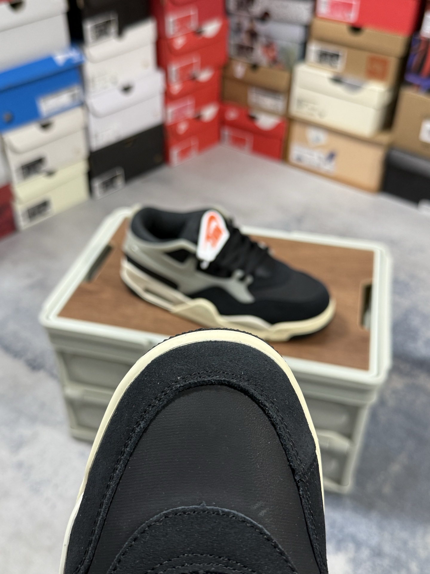采用了低帮的设计 并保留了众多AJ4的经典元素 鞋身以皮革、麂皮材质拼接打造 AJ4经典的TPU材质延伸至后跟 增强鞋款稳定性 而鞋身侧面的网格设计则被取消 尾部的NIKE AIR标志也得到保留 并同时带有飞人logo 中底部分同样搭载了可视AIR气垫 鞋底采用米白色中底和外底呈现 为整个设计收尾
