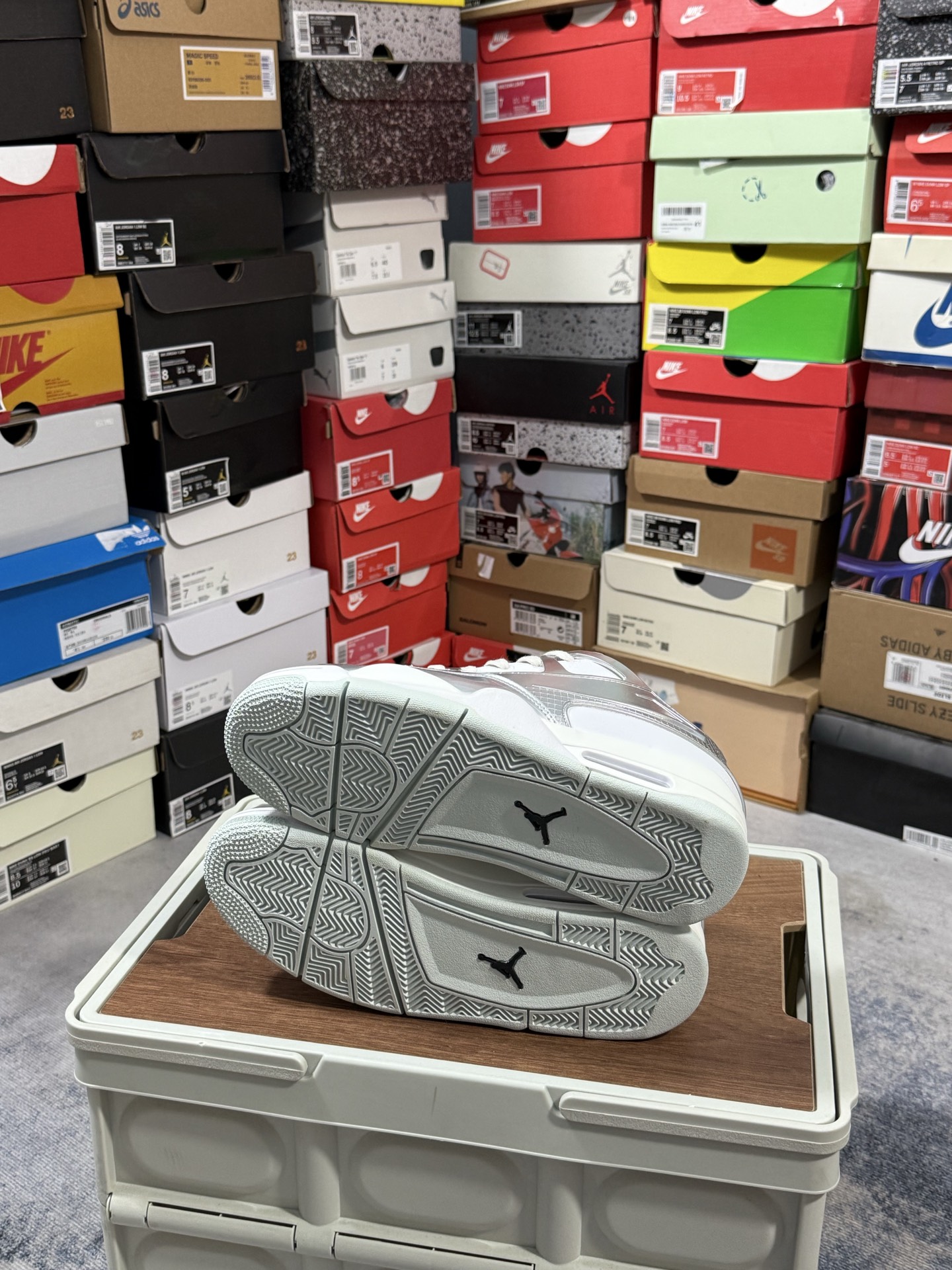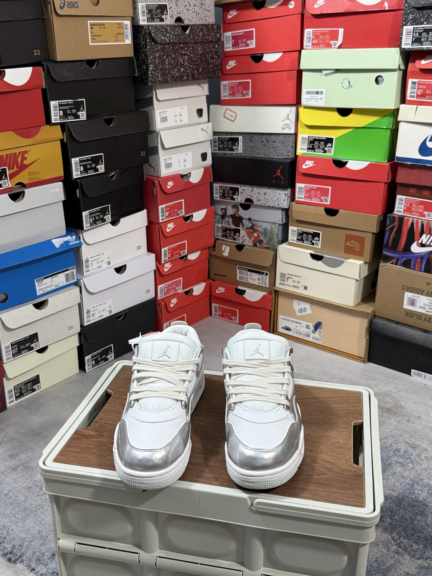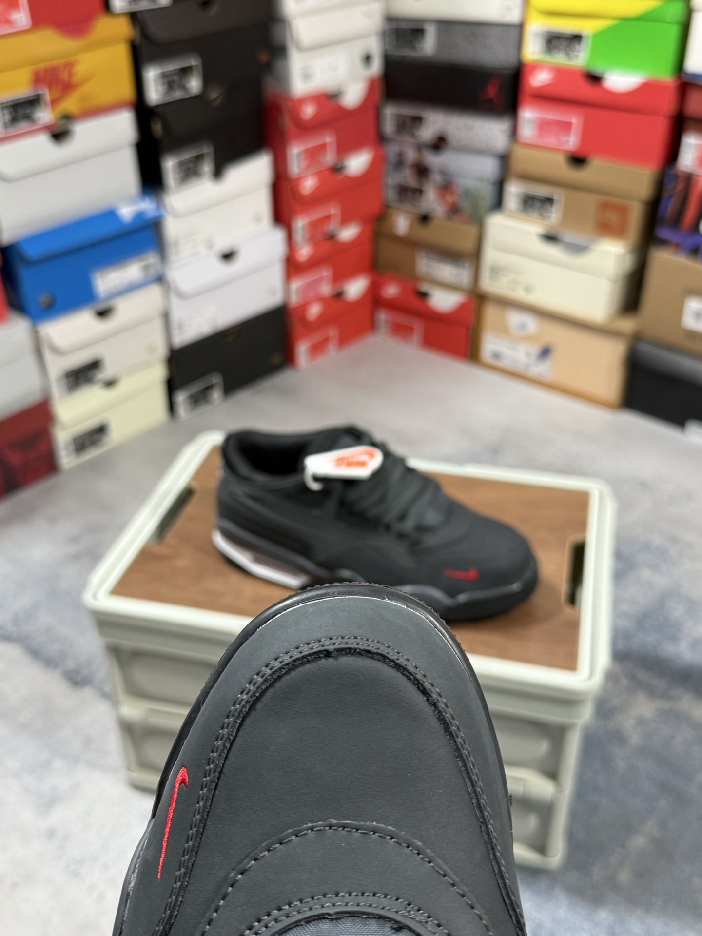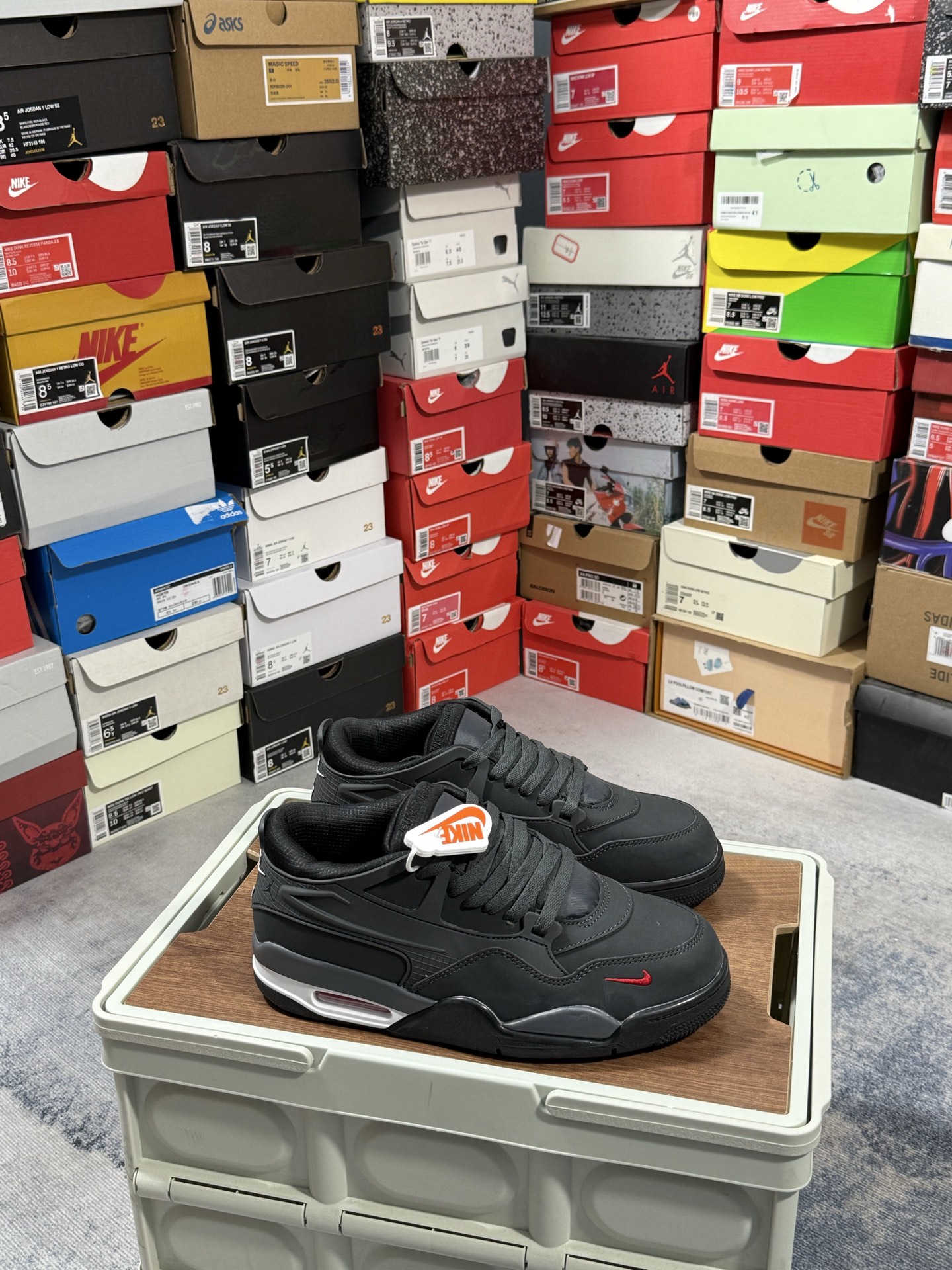采用了低帮的设计 并保留了众多AJ4的经典元素 鞋身以皮革、麂皮材质拼接打造 AJ4经典的TPU材质延伸至后跟 增强鞋款稳定性 而鞋身侧面的网格设计则被取消 尾部的NIKE AIR标志也得到保留 并同时带有飞人logo 中底部分同样搭载了可视AIR气垫 鞋底采用米白色中底和外底呈现 为整个设计收尾